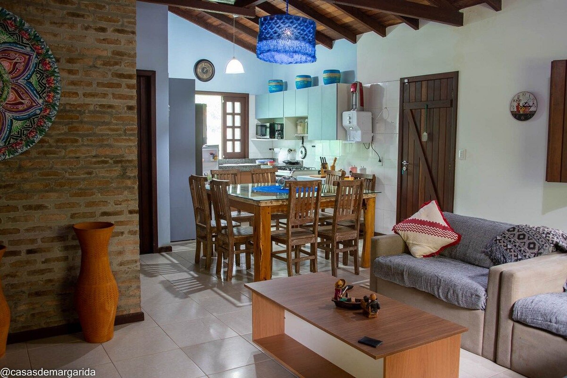 A casa conta com cozinha ampla, com conceito aberto, integrada com a sala de jantar e equipada com todas as facilidades básicas e eletrodomésticos. Está localizada em um condomínio e fica a 450 metros da praia. Cerca de 800 metros do ponto do ônibus que leva à vila.